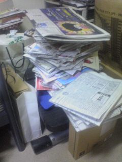 リテラル・サイ・トレーナーの上に、うず高く積み上がった新聞、雑誌類。地震がきたら、即、床になだれるが如くだった。この表現は、前回の様子である。
